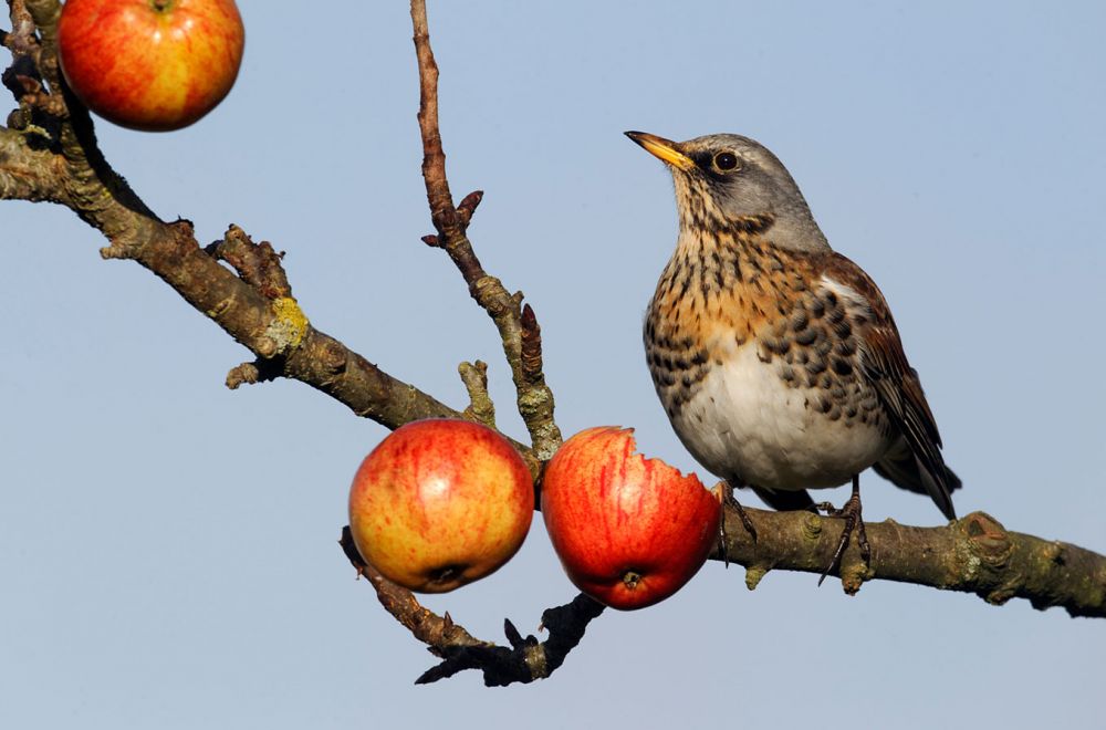 When the ground is frozen or covered in snow they become much tamer and easy birds to photograph. Apples become a major food source and they will come into orchards in large flocks. In a garden or at a feeding station one individual bird will become dominant and try to defend the fallen apples for himself. It is noteworthy that if they start to feed on one apple they will keep going until it is finished and ignore other apples close by.